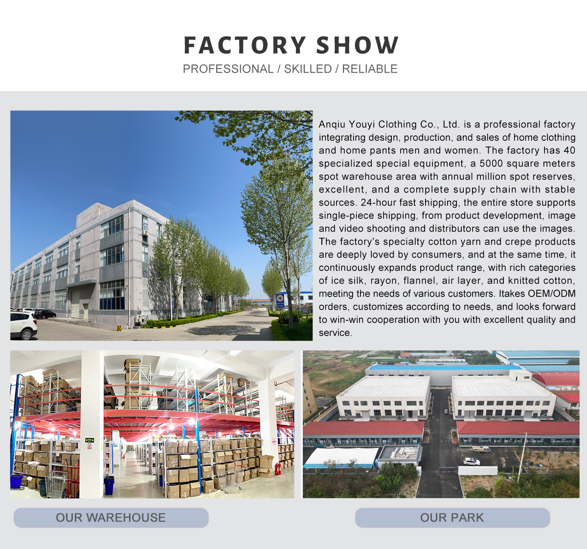 Shandong Youyi Clothing Co., Ltd., established in 2015, is a professional pajama manufacturing company. The company's main products are pure cotton gauze pajamas, as well as best-selling products made of various fabrics such as gauze bathrobes, coral fleece pajamas, knitted pajamas, etc. We have a factory area of 9000 square meters, a stock of 500000 pieces, 200 production personnel, and can undertake OEM/ODM orders, The company is committed to product design, printing a variety of patterns, and customizing according to demand. We look forward to cooperating with you for win-win results with excellent quality and service.